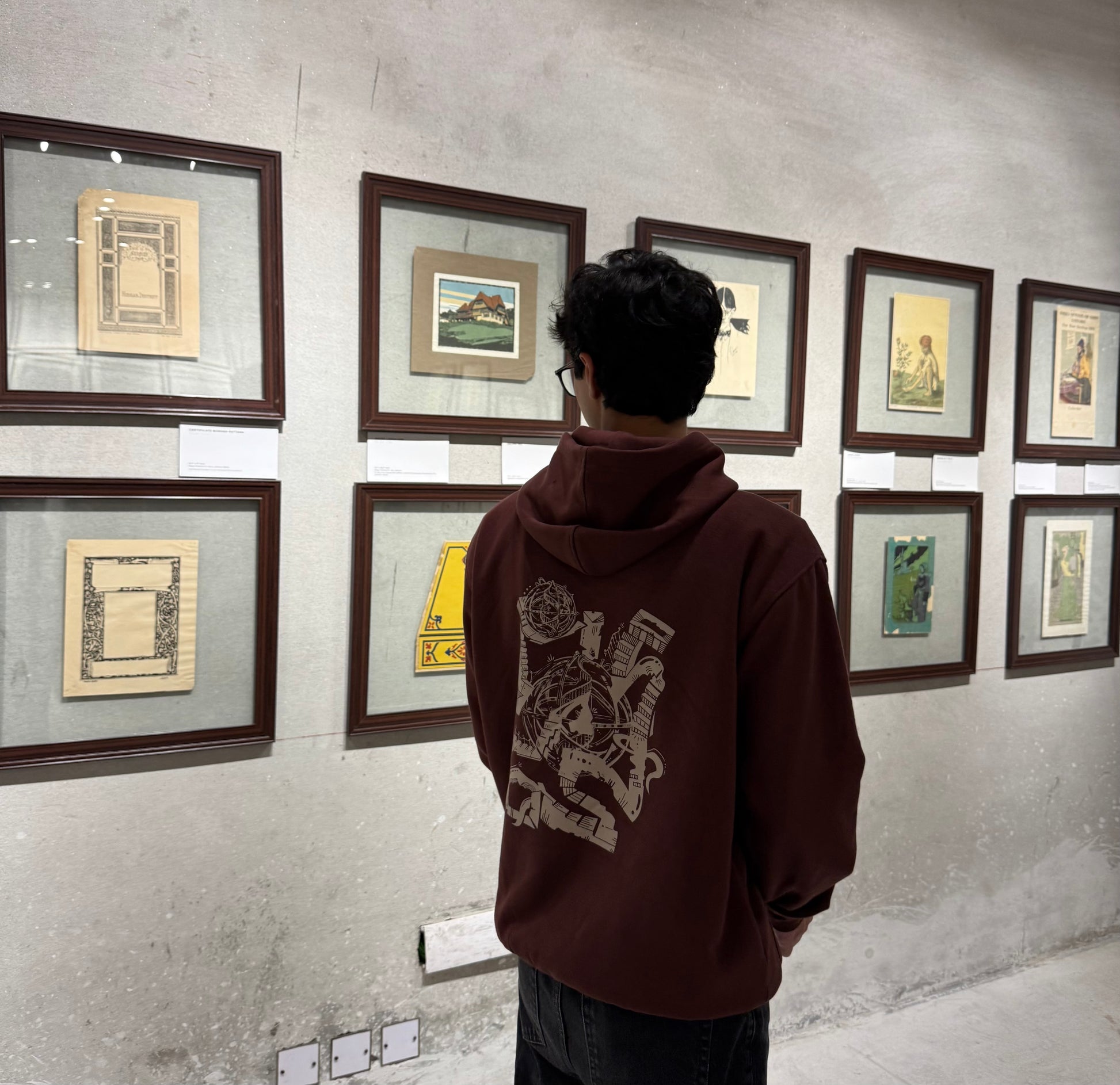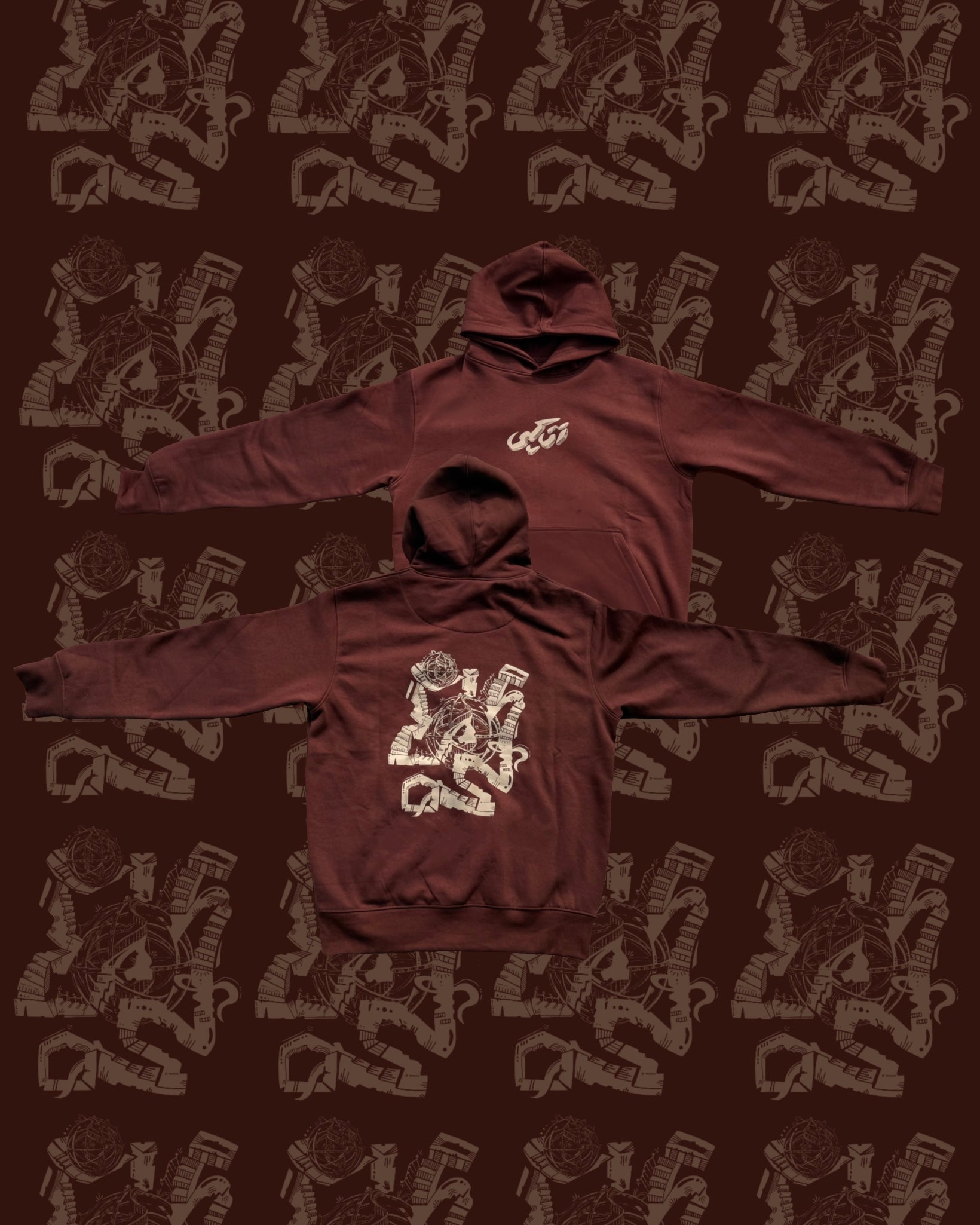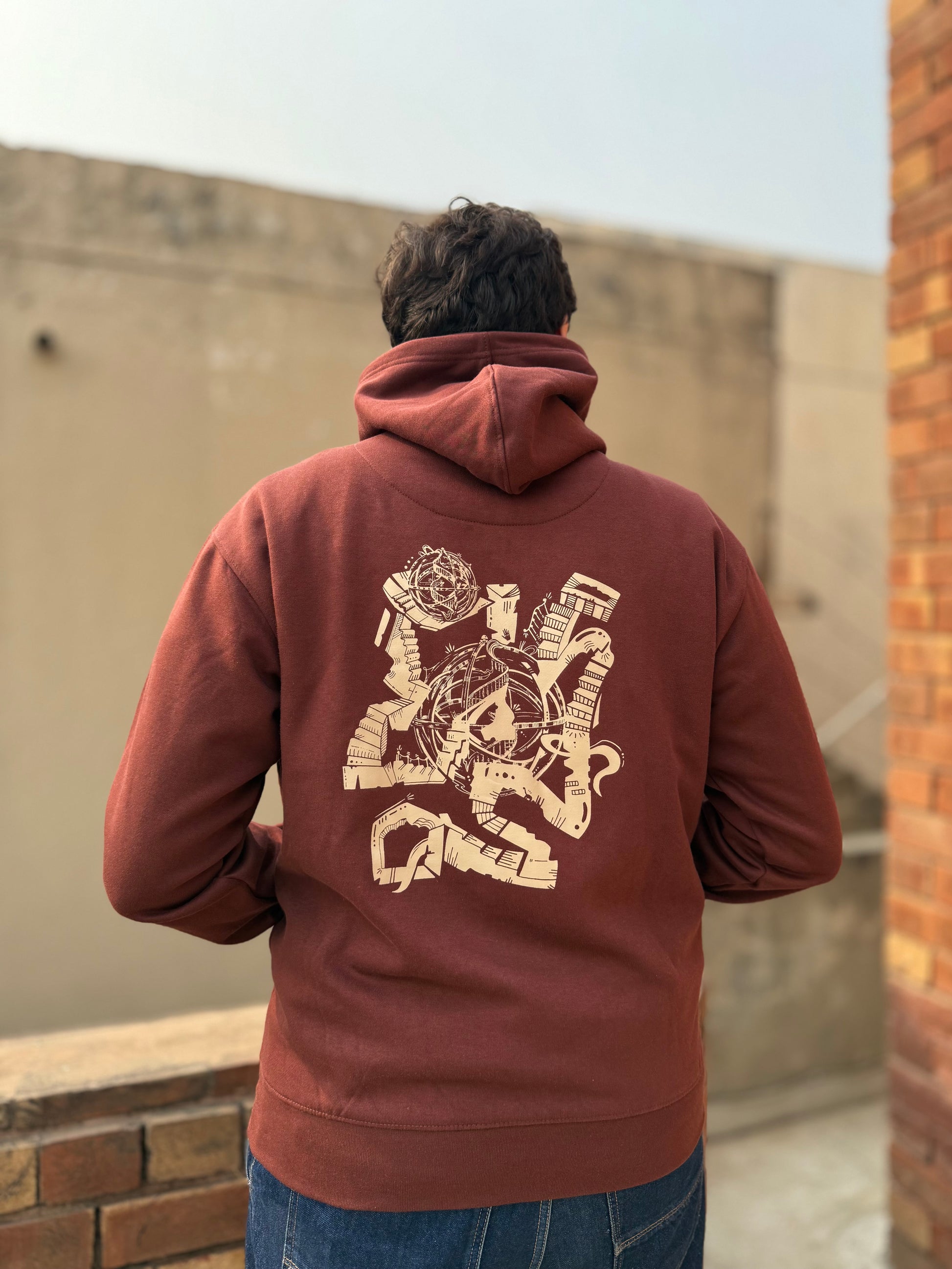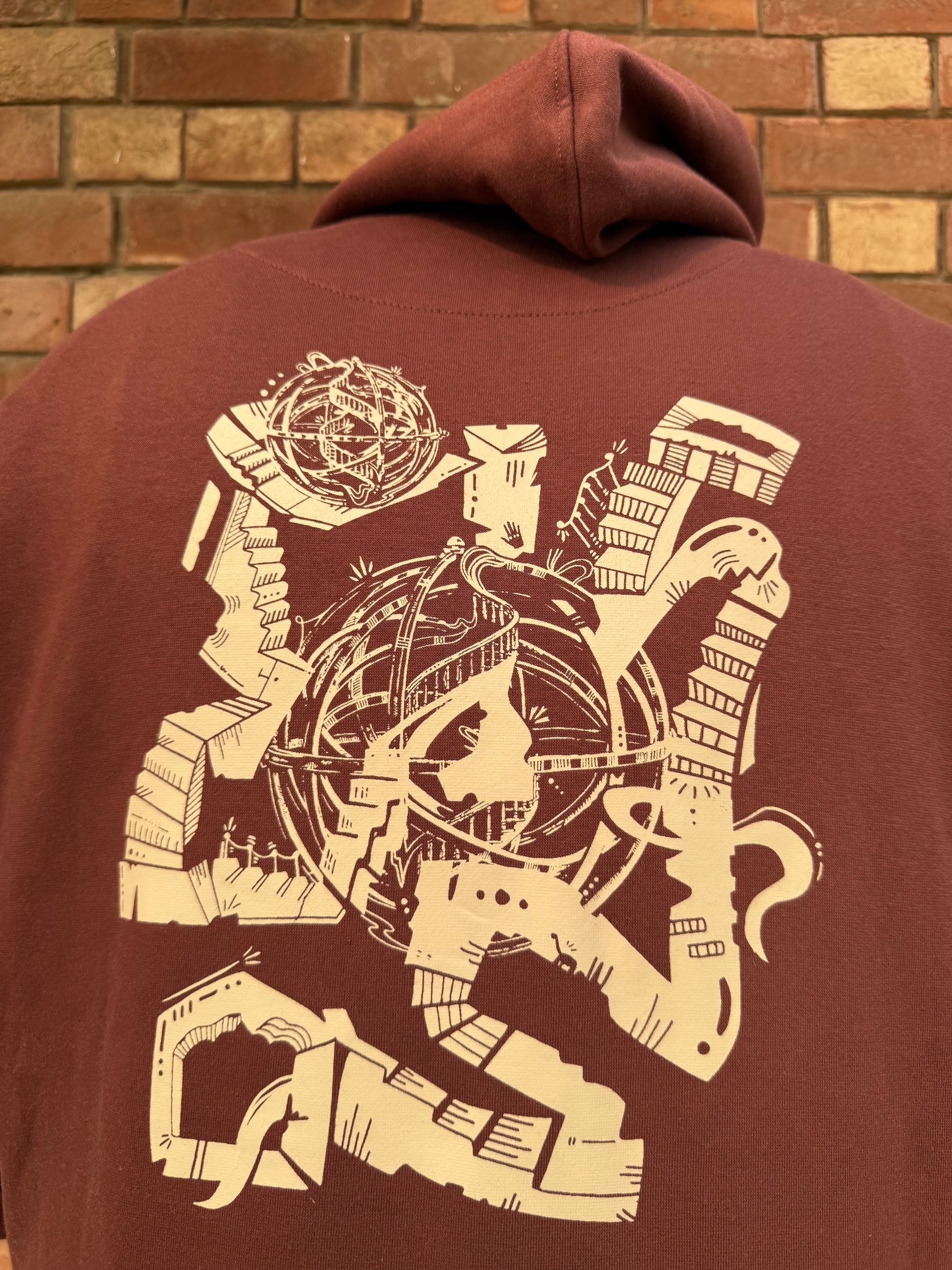 - Design: Deep brown base with warm-toned abstract staircase motifs, screen-printed in a sculptural arrangement across the back.