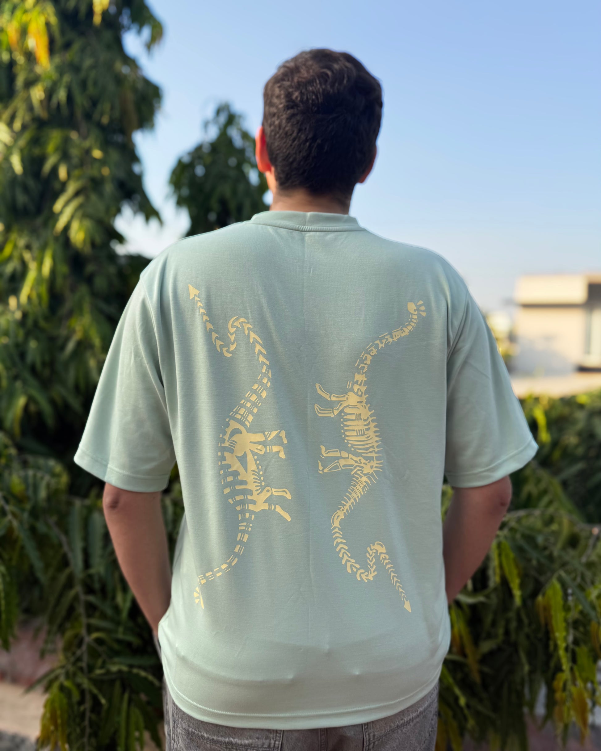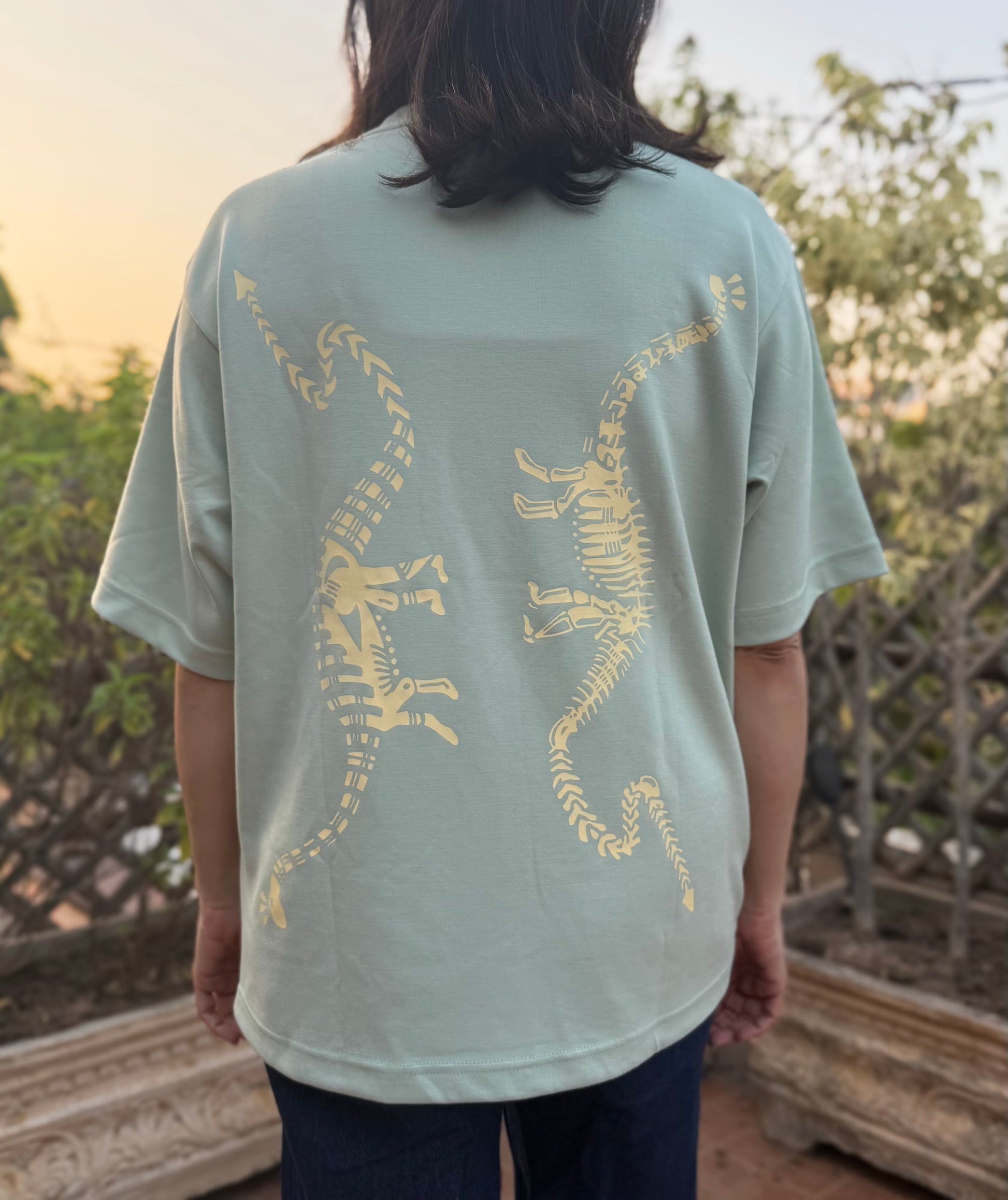 - Design: Pastel green base with cream-toned, fossil-inspired motifs. Each piece reflects natural variation in screen printing, reminiscent of artifacts shaped by time.