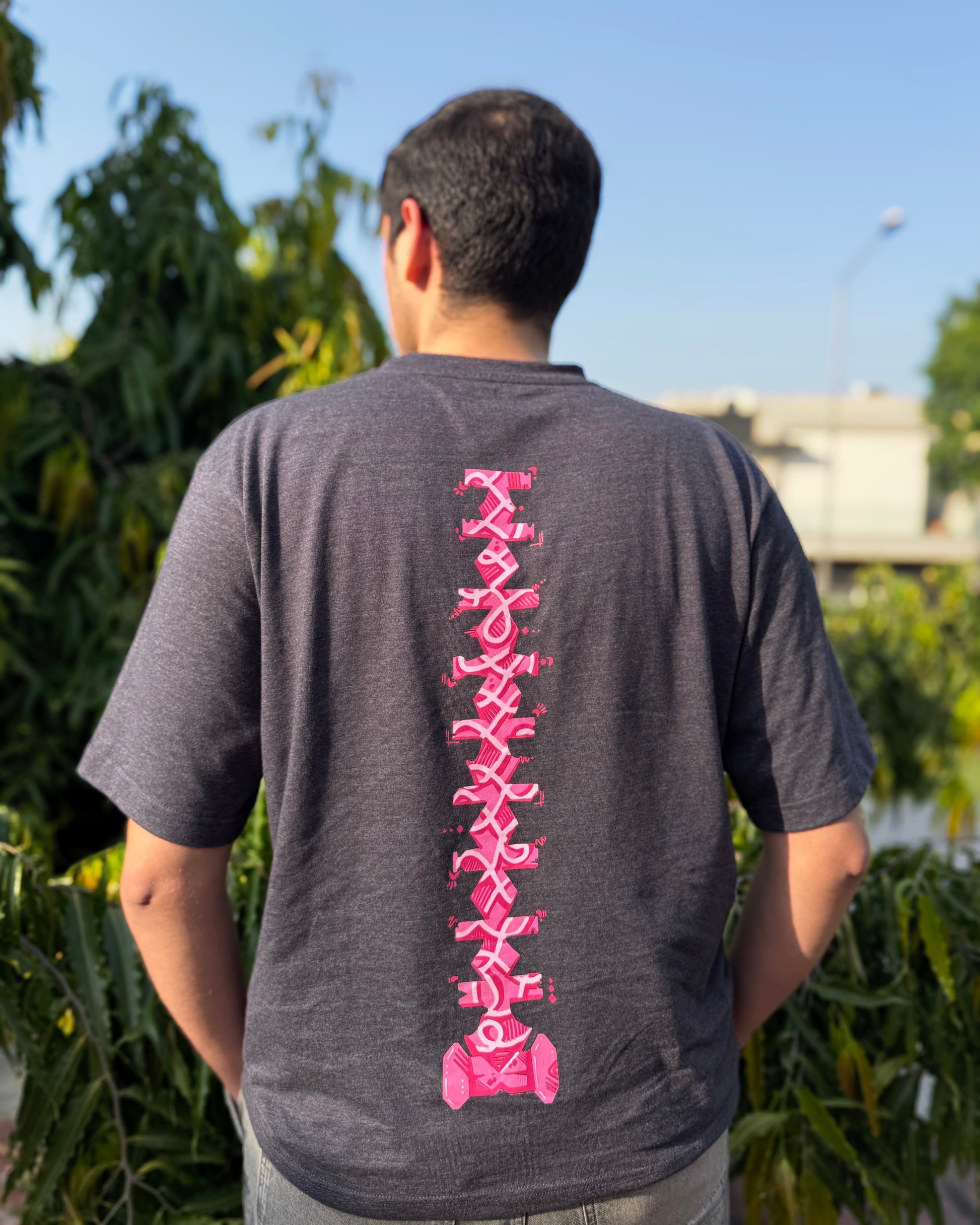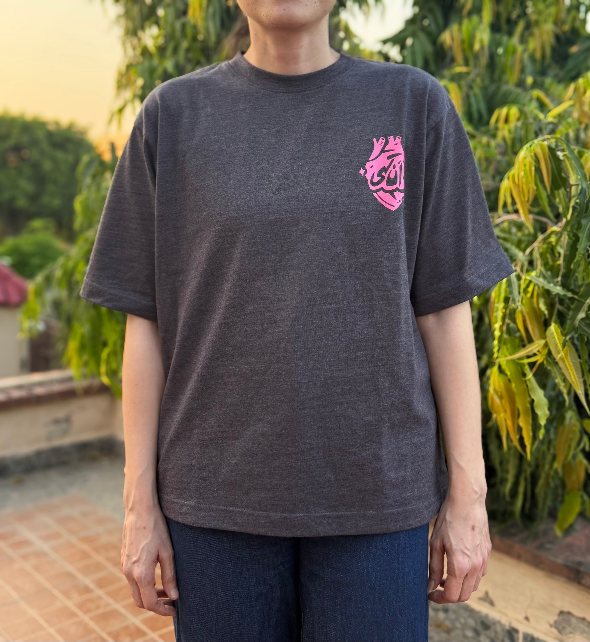 - Design: Dark grey base with delicate pink detailing, featuring a distinctive spine graphic on the back and a heart logo that symbolises connection and care. There may be variations due to the handcrafted production and screen printing.